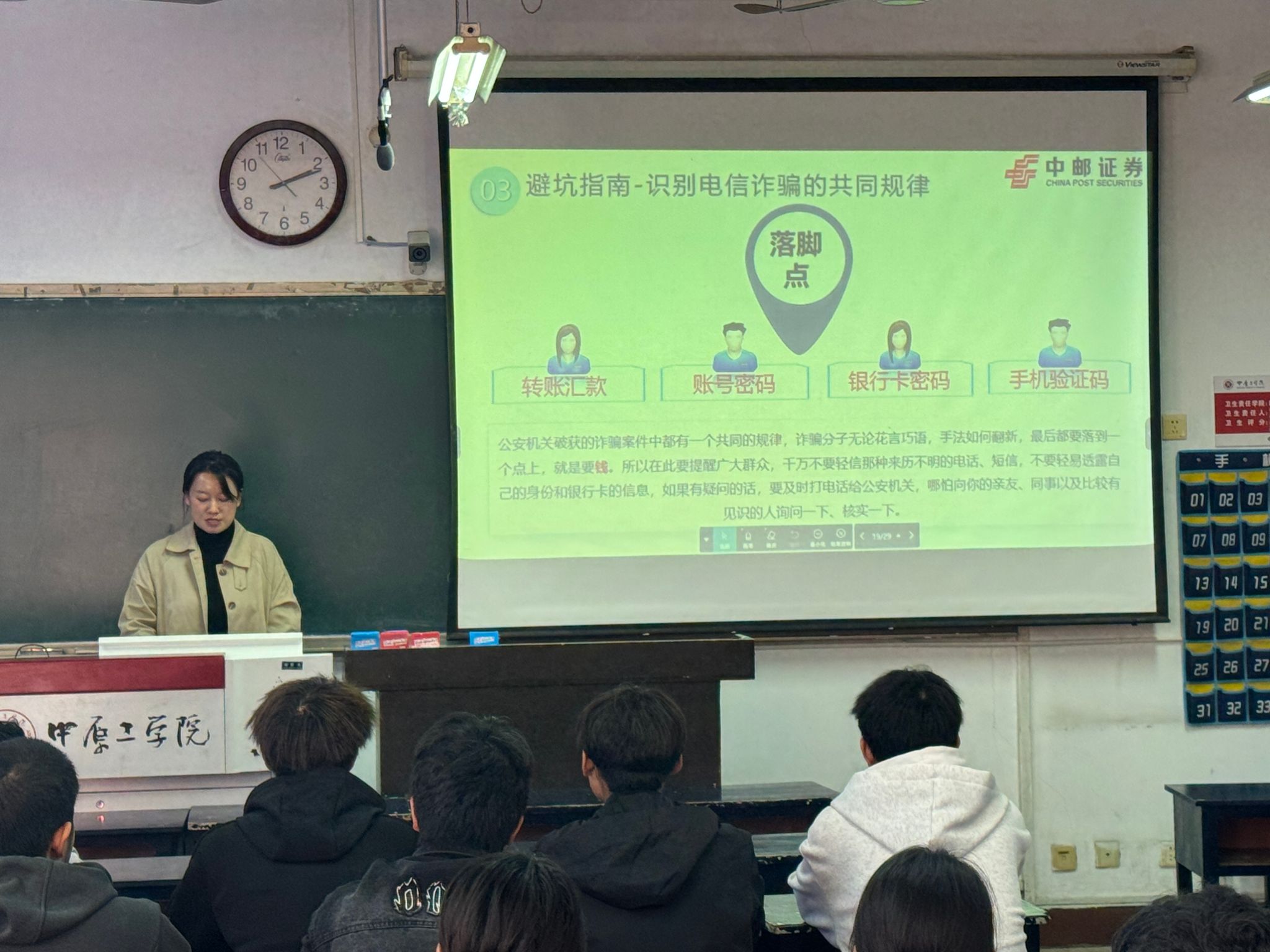 本次宣讲由中邮证券讲师徐淑君主讲。她从宏观金融安全环境切入,结合中邮证券在业务一线监测到的风险动态,深刻阐述了当前大学生成为诈骗主要目标的根源,强调了学习反诈知识不是“可选品”,而是保障个人财产和信用安全的“必修课”。她系统梳理了针对学生群体高发的诈骗类型,重点揭示了如“冒充客服”、“刷单”、“非法校园贷”等新型骗局,让同学们对诈骗形式有了更全面的认识。通过分析典型金融诈骗案例,一步步还原受害者的受骗过程和心理活动,直观揭示了骗子的套路之深与危害之大,给予了同学们最直接的警示。