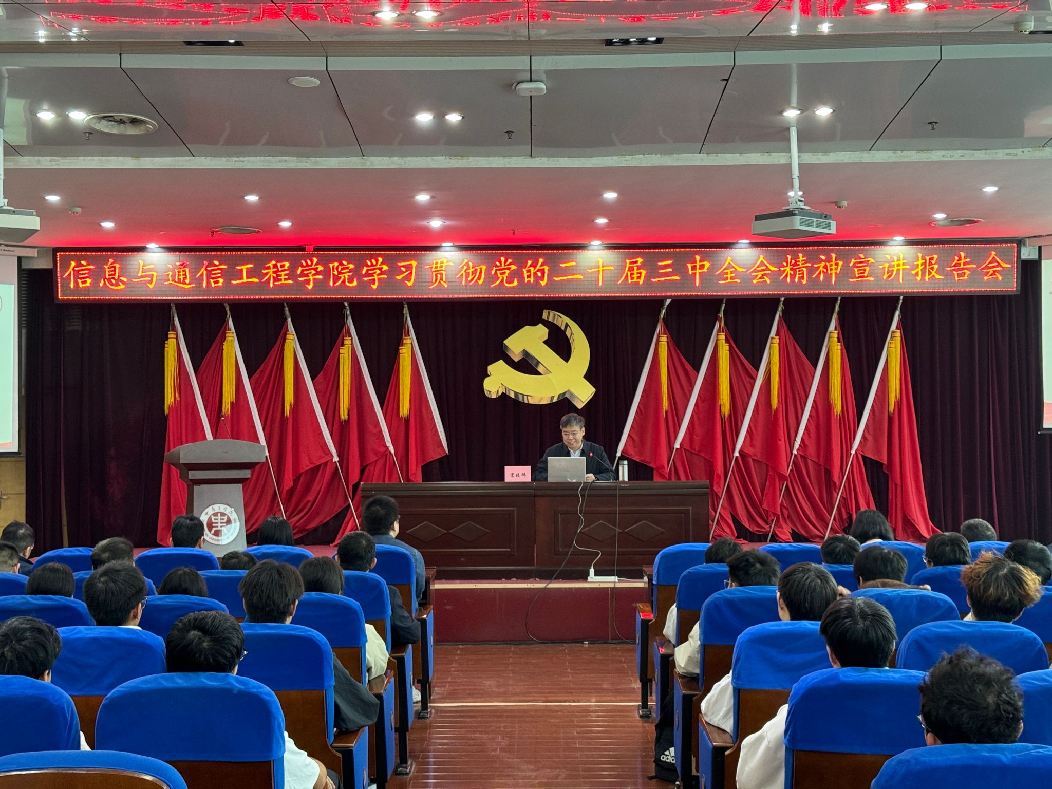 在图书馆报告厅举办学习贯彻党的二十届三中全会精神宣讲报告会。校党委副书记、工会主席宋晓炜,以《把握职责使命 主动挺膺担当--学习贯彻党的二十届三中全会精神投身学校改革发展》为题,为H文书包网全体教师、学生代表200余人进行宣讲。会议由党总支书记邹海林主持。