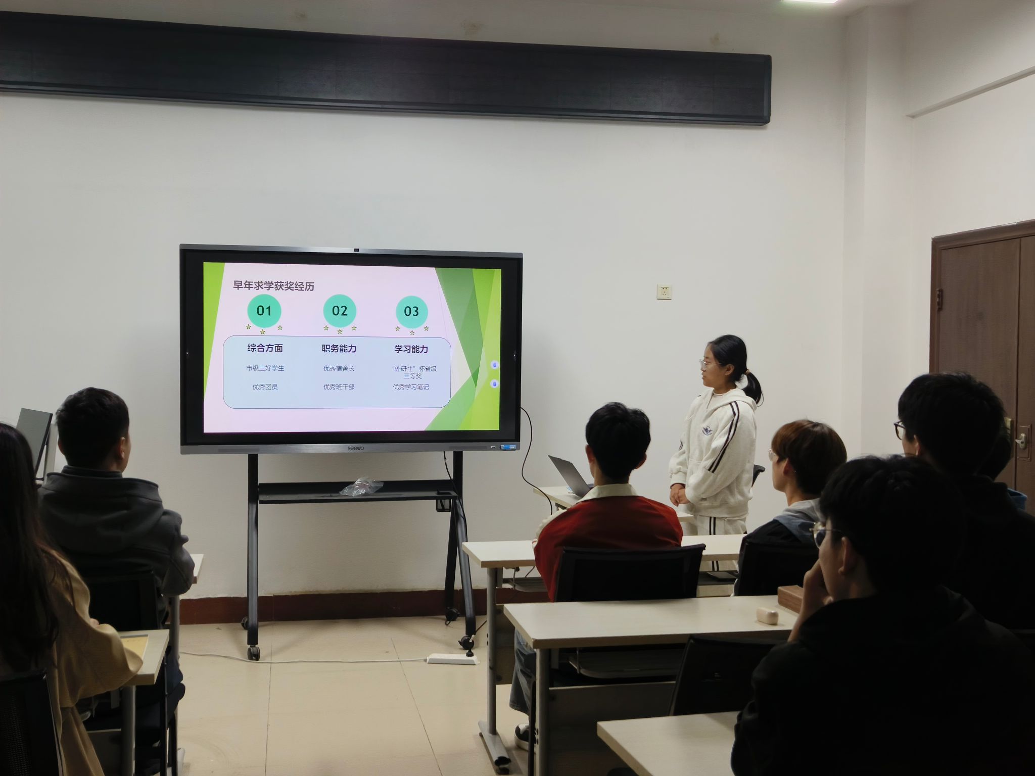 活动伊始,魏老师详细介绍了本次评选的标准和流程。评选工作坚持公平、公正、公开的原则,经过层层筛选和严格审核,最终从众多候选人中选出了7名“励志之星”。他们不仅在学业上成绩优异,更在学科竞赛、社会服务等方面展现了突出能力和良好的精神风貌。